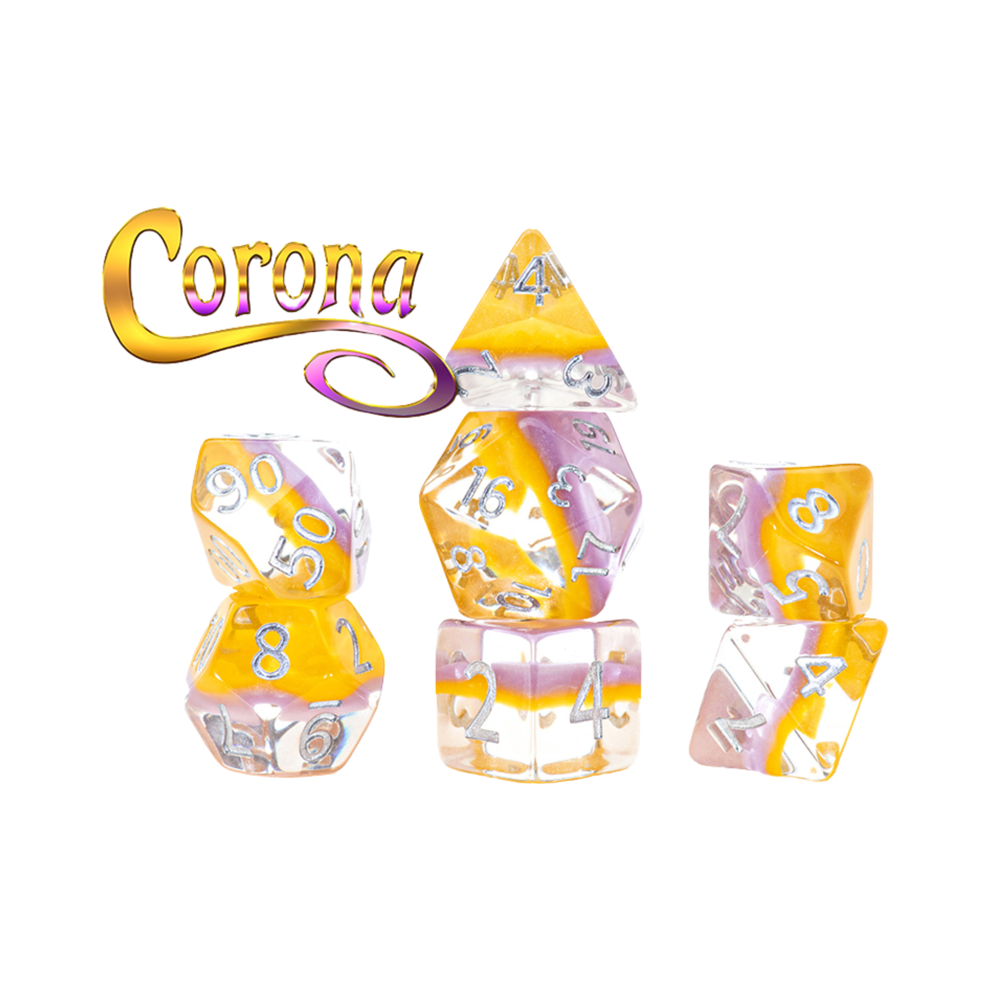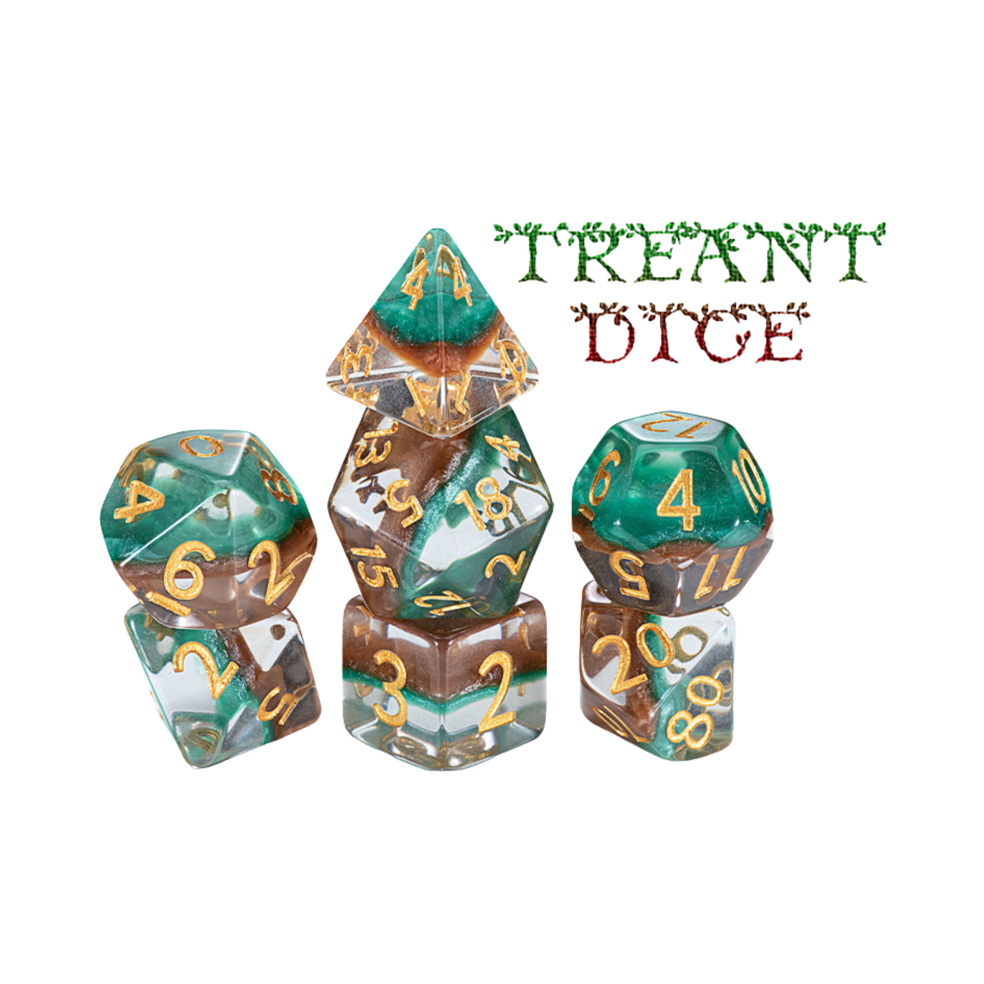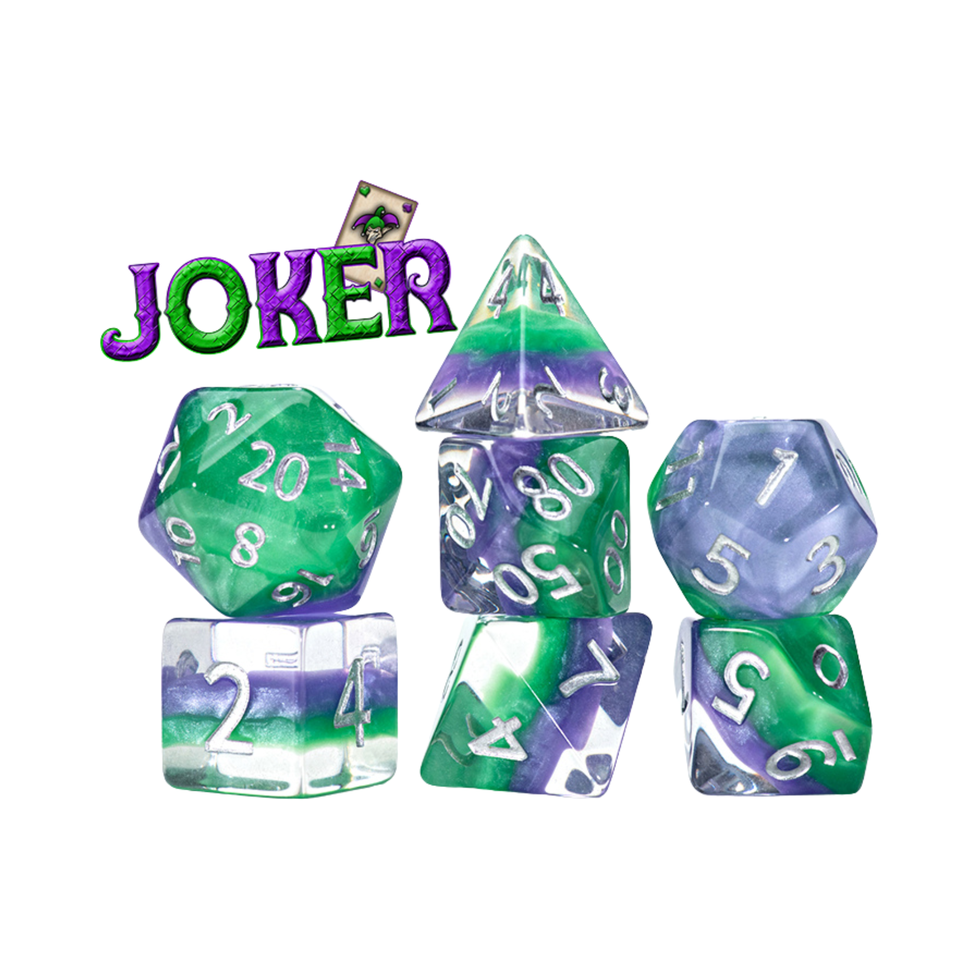 7-Die Sets – Contains a d4, d6, d8, d10, d% (00), d12 and a d20.