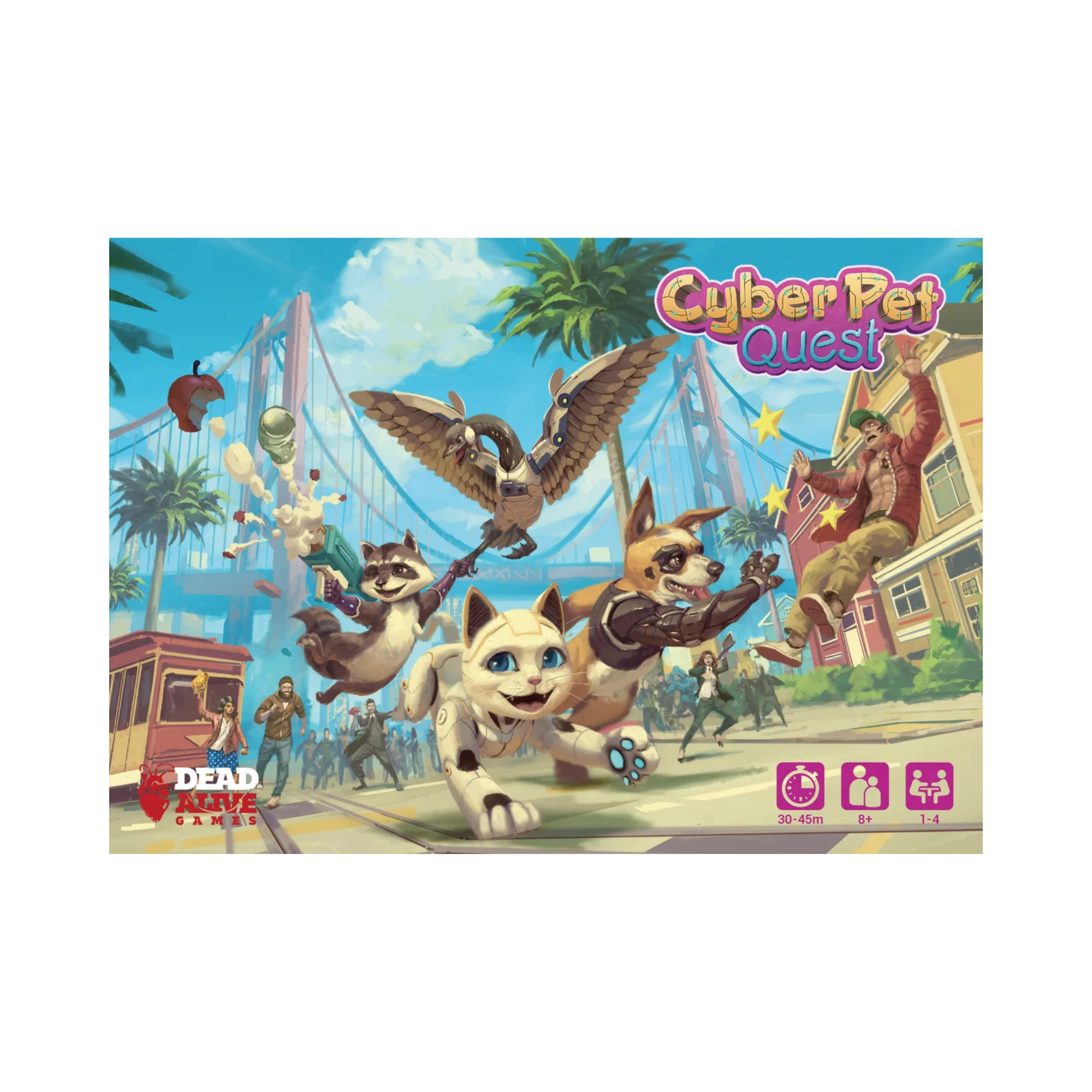 30 Item Cards, 50 Objective Cards, 16 Charm Cards, 4 Pet Meeples, 4 CyMS Meeples, 1 CyMS Boss Meeple, 16 Tracking Cubes, 3 Energy Dice, 1 Dodge Die, 1 Aggro Token, 4 Pet Tag Tokens, 6 Item Tokens, 8 Impact Tokens, 6 Objective Tokens, 15 Campaign Tokens, 1 Round Tracker, 4 Saved Game Envelopes, 1 CyMS (Enemy) Board (back side of lid), 1 Rulebook, 4 Player Boards, 4 Reference Cards, 8 Pet Cards, 8 Pet Upgrade Cards, 16 Location Cards, 8 Boss Cards, 9 Initiative Cards, 10 CyMS Cards