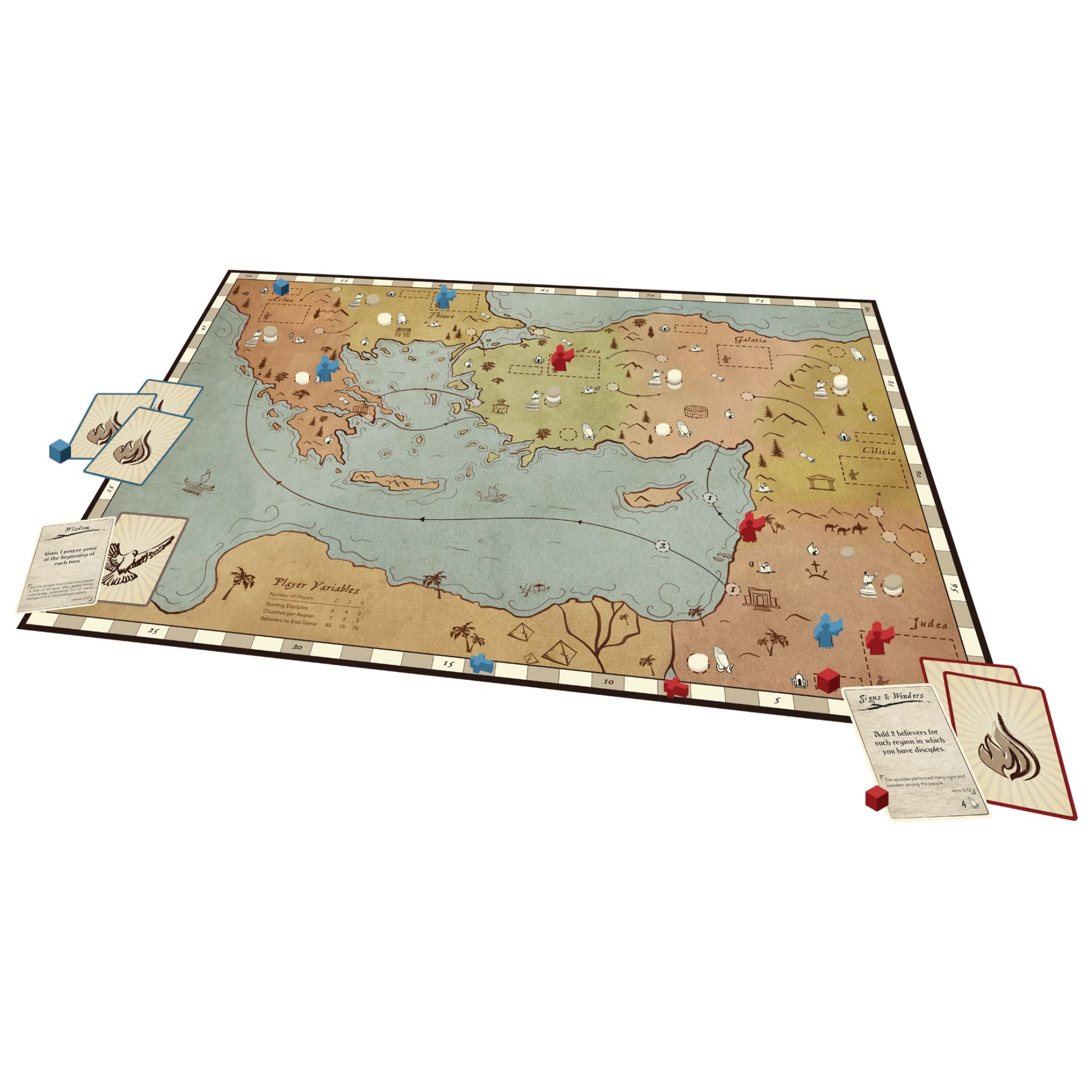 Each turn you can preach, pray, plant churches, write letters, disciple others, and perform mighty miracles. Race to reach the farthest provinces first, or focus your strategy around the spiritual gifts you have gained. With multiple paths to victory, every game is unique. The game board features the familiar map of the first missionary journeys and each card in the game highlights a scripture passage.