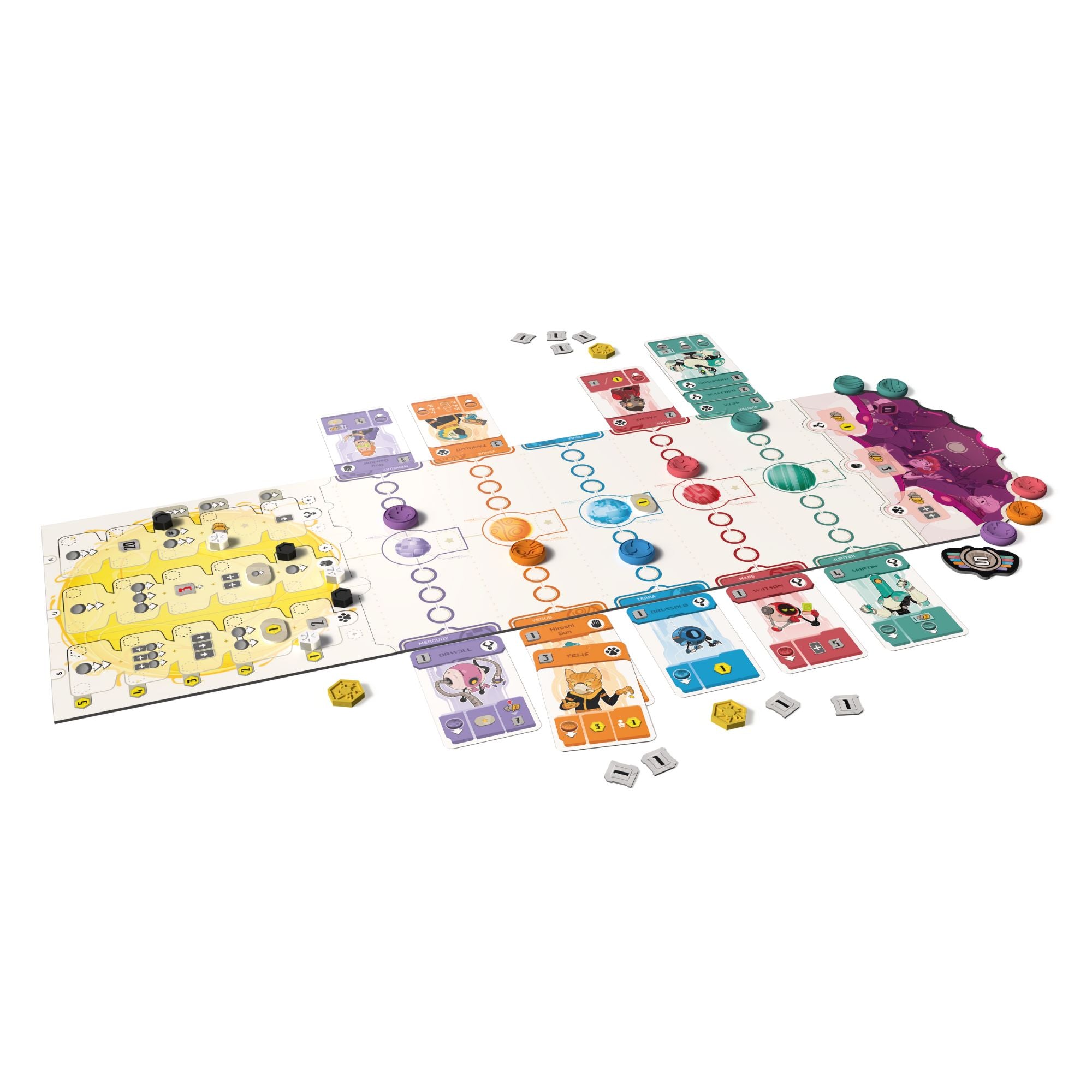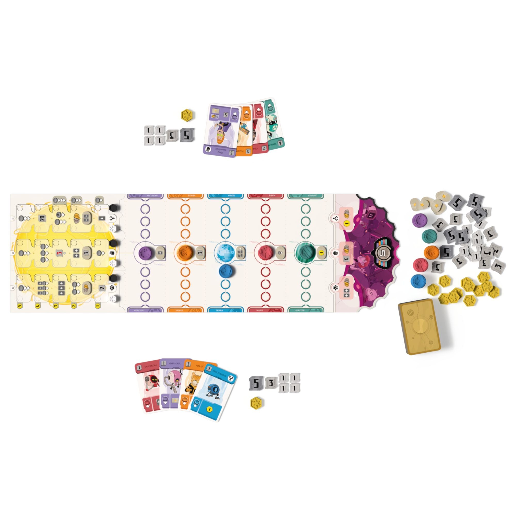 90 cards, 20 Influence discs, 1 Leader token, 20 Credit tokens, 20 Meridium tokens, 10 Bonus tokens, 6 Research markers,1 Game board, 1 Research board, 1 Rulebook